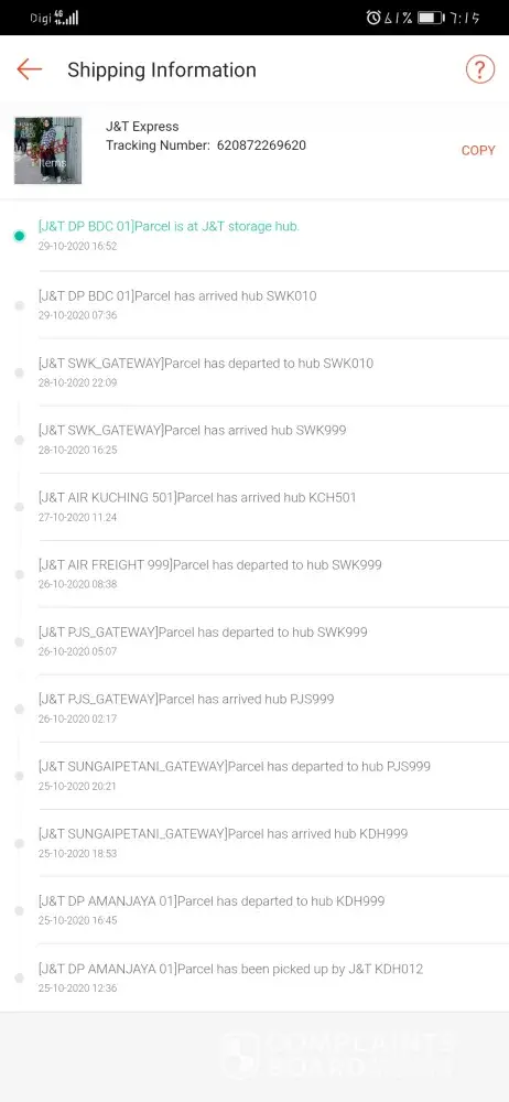 May I know status of my parcel? Travel around without any single call asking me... From HUB to Semariang DP to Samarahan DP again to Samarahan DP... This parcel ship out middle of month till now not received... Please do something...