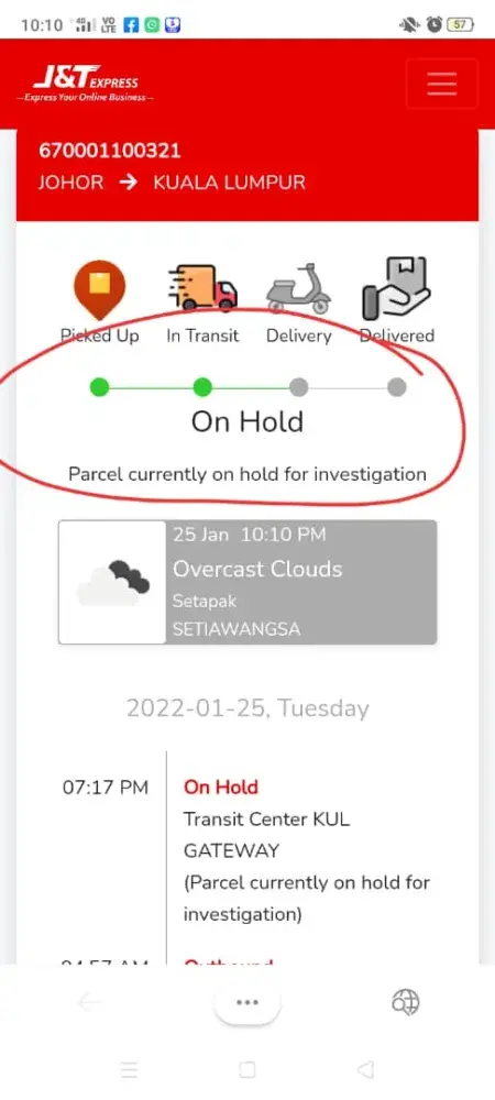 Where is my parcel ? Why on hold - bad weather ? How long for me to wait for it ? Already at kempas . Why can't delivery at Taman U ? Hotline cutomer service also bad .