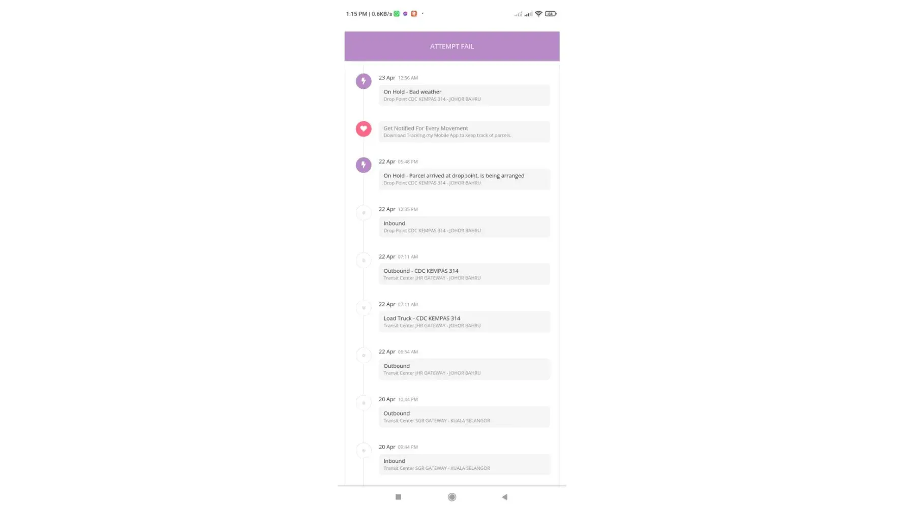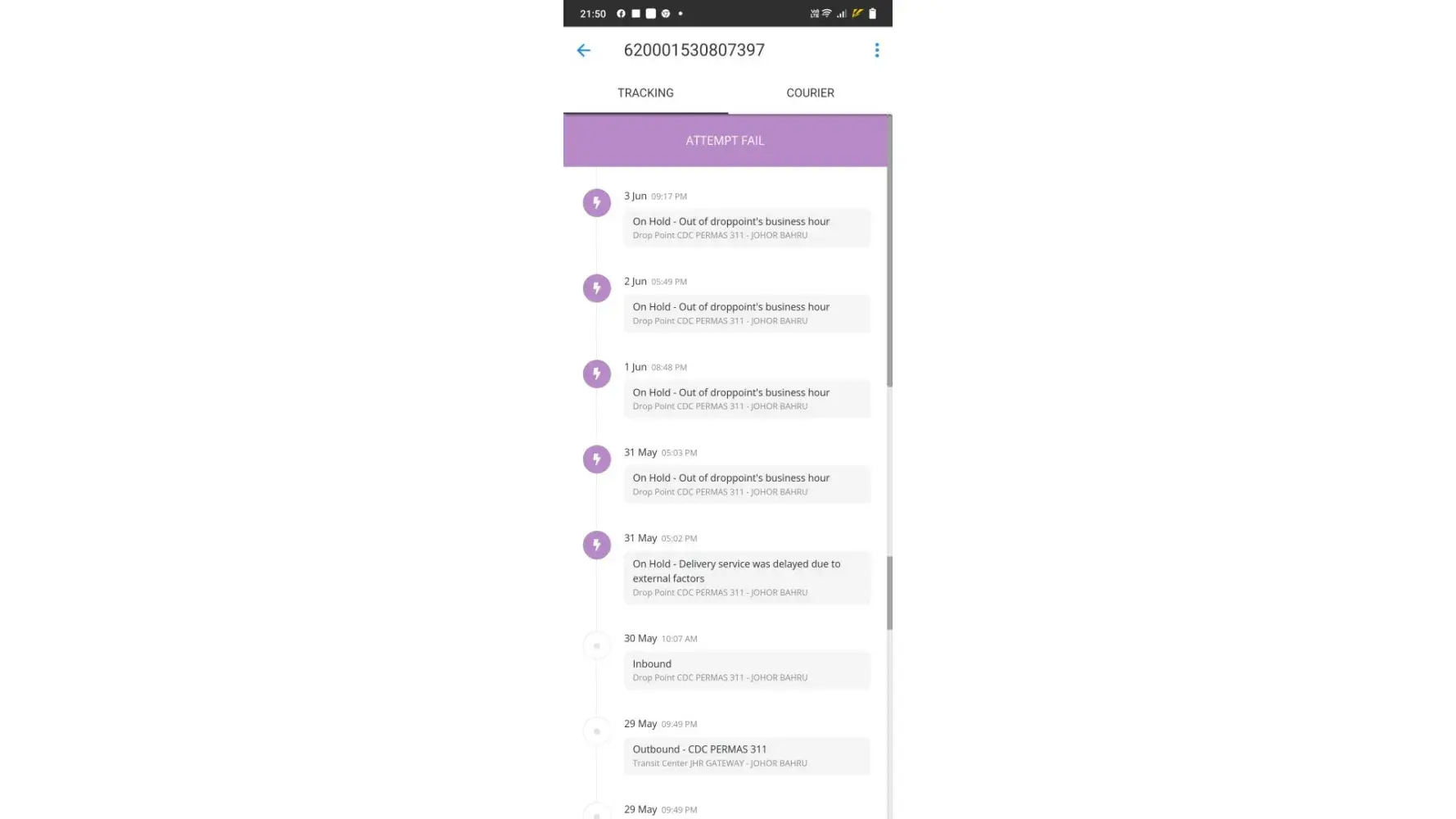 J&T is irresponsible. It happened 2 times they even don’t deliver properly. They choose to cancel. Also if u go to self collect it they will tell the parcel is not there. So poor service. They hold my parcel now it is 4days already. Yet no update. I have tried to contact yet no response. Such irresponsible behaviour during this important time of EId.