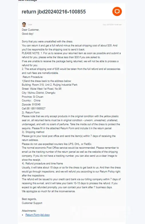 The site says you have 14 days from when the product arrives to initiate a return and gives you an email address to send your order number to. No one answers me for almost a week, I even follow up because I’m worried about meeting their time own window. When they do reply, they don’t send the return form and provide a return address as their policy states. Instead they send me a multi paragraph email about how it’s going to cost me about half the dress price to ship it back to China and if I don’t want to do that I can donate it to goodwill and they’ll give me 70% back. Where was this in their return process? I have to ship to a foreign country at my own cost and they don’t receive typical shipping vendors? Take it to Goodwill for some of my money back?