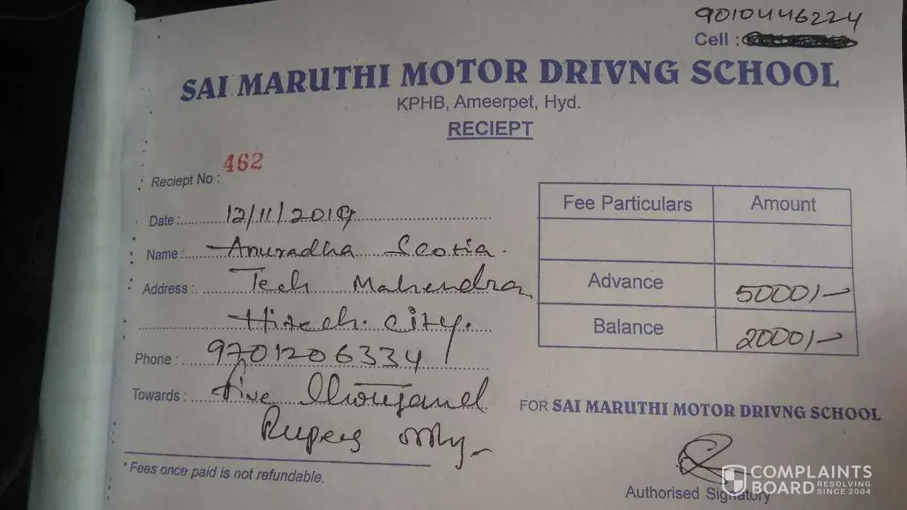 Myself Anruadha an IT professional from Hyderabad. There is a driving school namely 'Sai Motor Driving school- in kphb, Hyderabad' region that I got form Just Dial only (PFA proof of this). I joined this school to learn Car Driving on 7th Nov 2019.These guys came for 4 classes, took money of 5000 INR from me (as they said an urgency telling they would book slot for my LLR in 3 days, so this would incur money). So I paid them this amount. That's it. Since then, these ppl are non -reachable or they keep their phones Switched off.I'am facing so much agony since the past 2 days(as i paid them amount on 12th Nov) and its getting too much now.These ppl are pure cheaters and company is fraud as they cheated me.