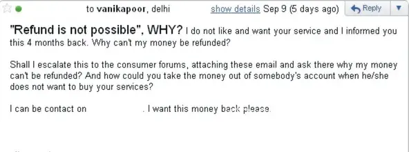 now we are not interested, as informed earlier refund our full money with interest including loss of revenue to us latest by tuesday 13th sept2011, failing which we will initiate legal action both civil and criminal including winding up of your company under section 432/434 of company law from mumbai high court.we will also inform all authorities including media, s.e.b.i, ministry of corporate affairs.