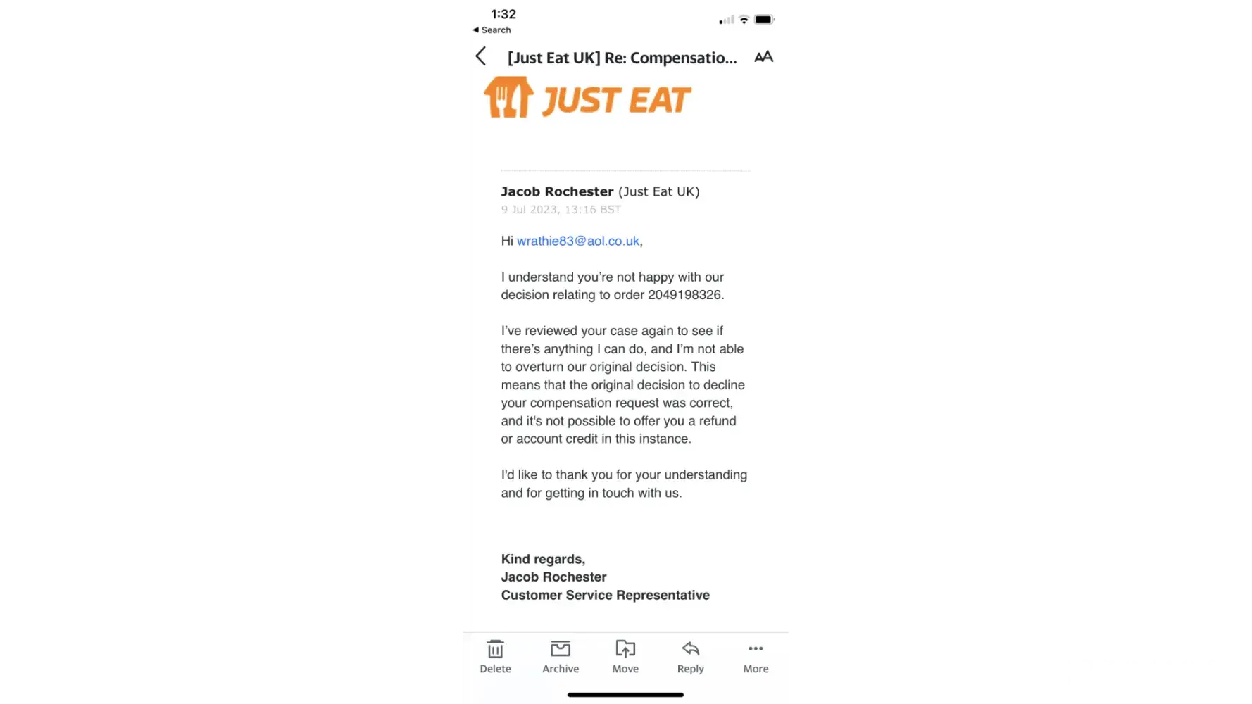 Desired outcome: Full refund an apology and a McDonald’s on just eat as compensation