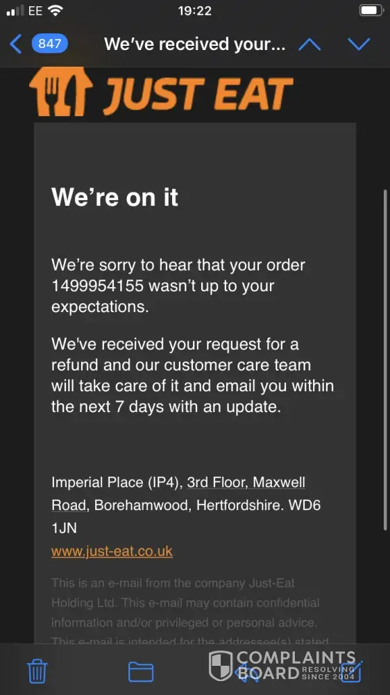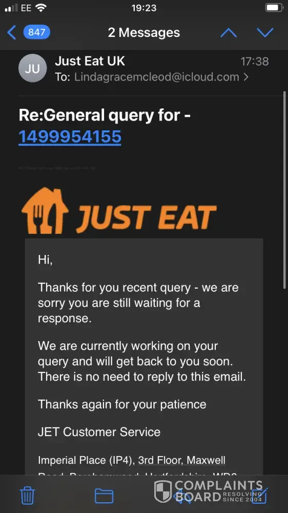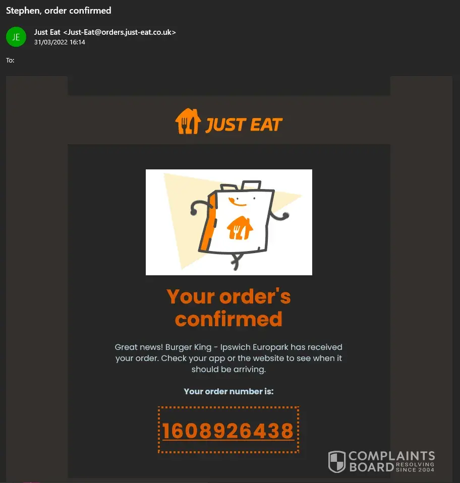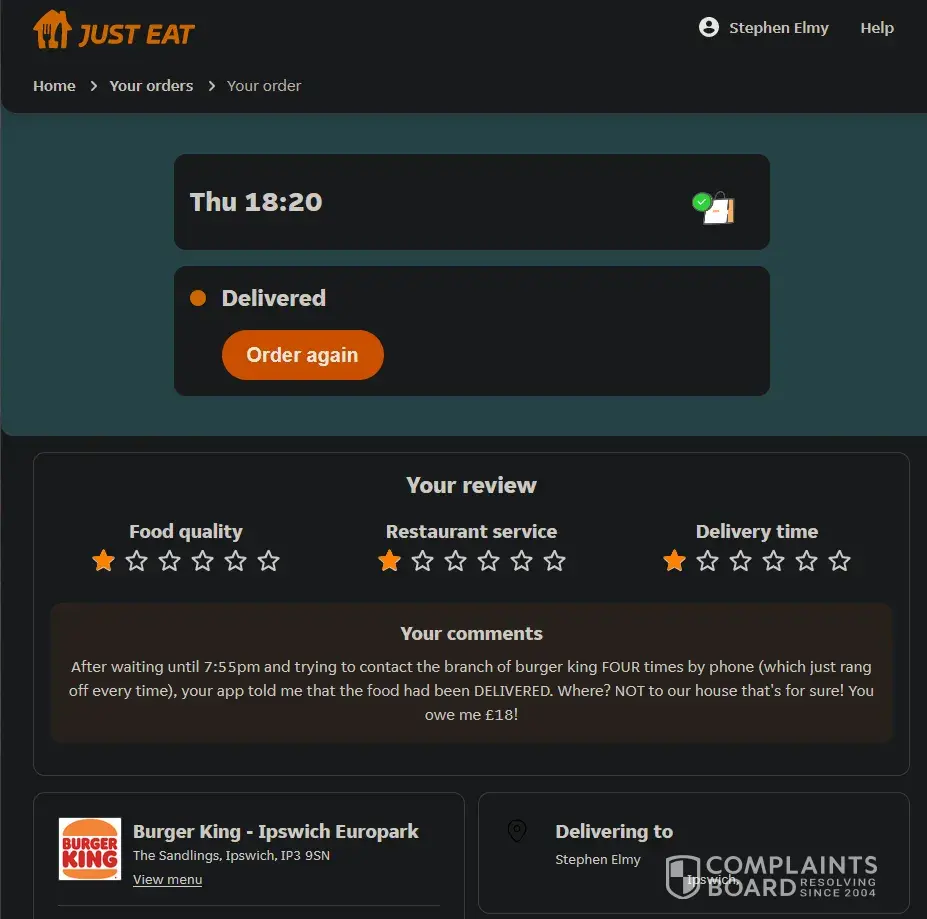 On Thursday March 31st I Made my weekly Takeaway Order, this time with Burger King in Ipswich. The order was paid for and confirmed by both Just Eat, PayPal and the branch of Burger King at 16:14pm, with requested a delivery time of about 18:15pm. I arrived home early from work, and both myself and my wife waited in our Lounge (we live in a terrace house and this room is right at the front of the house for our food to arrive. The only sound we heard outside pertaining to a takeaway delivery was next door at a little while after 18:00. When my wife became concerned as to where our food was, I looked at the order screen, and it showed "18:20", "waiting for update" (with a spinning hourglass), and "driver assigned". At about 18:30pm I decided to try and telephone the branch of Burger King, but was unable to get anybody to pick up at the other end on three separate occasions (between approximately 18:30pm and 19:10pm), it simply rang and rang until the line beeped. At 19:30pm, the order screen finally changed status, to "DELIVERED", still with the time "18:20". I was understandably furious about this, and left a triple 1-Star review as a result. I have attached to this complaint a screenshot of the confirmation email I received from Just Eat (with order number), one of the order screen on the Just Eat Website with it's review, and one of the PayPal confirmation email, complete with date and time (31/03/2022, 16:14).