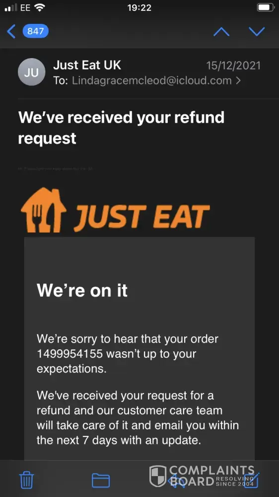 I created an order through Justeat on the 15/12/21. The order never arrived and I was assured a refund of £16 would be issued. I am still awaiting this refund over a month later, and after numerous online chats/emails, I am still not receiving my money.