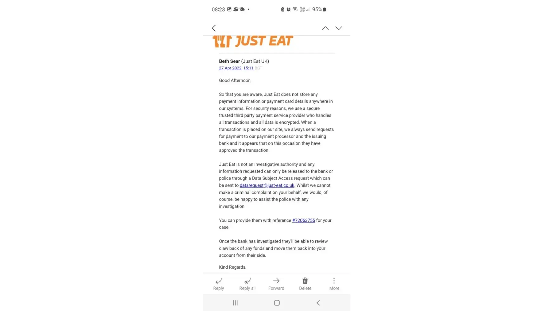 My just eat account was hacked by someone in Scotland and items ordered and delivered to them in Scotland using my bank details stored with just eat.