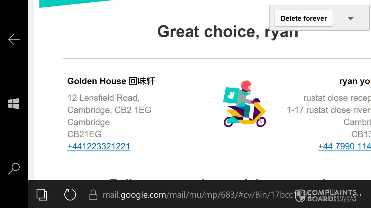 I just closed my account with Just Eat as it seems someone is allowing to use my name and account to order and deliver food to addresses nowhere near my address! I find Just Eat has no security measure and I am afraid this is an inside job stealing people's identity at their leisure without any support from Just Eat to victims or customers! Finding a customer service number is like finding a needle in a hay stack and trying to get some help is beyond impossible! Never ever use Just Eat ever again!