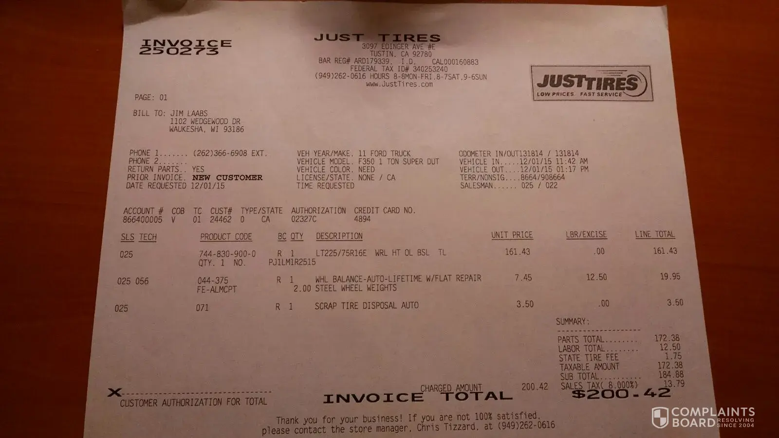 On December 1, 2015 I noticed a bulge in my company's truck tire. I purchased a replacement for it at Just Tires in Tustin, CA. They assured my that they had the correct size which was LT225/75R16. Just this week (March 28, 2016) I was contacted by my coworker, who sent me a photo of the tire, which had only 6, 000 miles on it. That tire, and the one next...