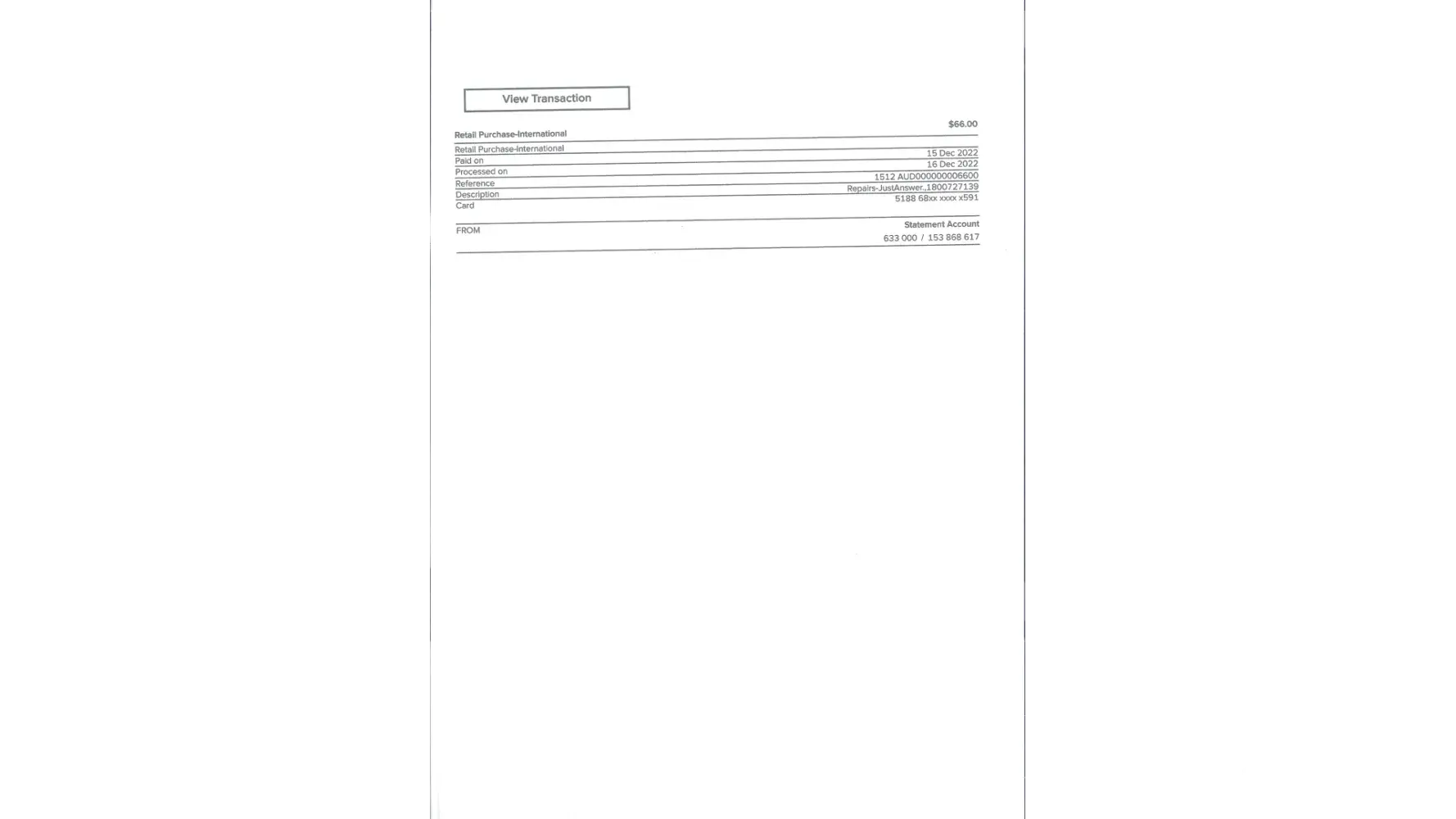 On December 15 2022, an amount of A$66 has been taken out of my account with no explanation. I wish to know what it is for as I have not used the service at any time recently and did not authorise this amount to be deducted