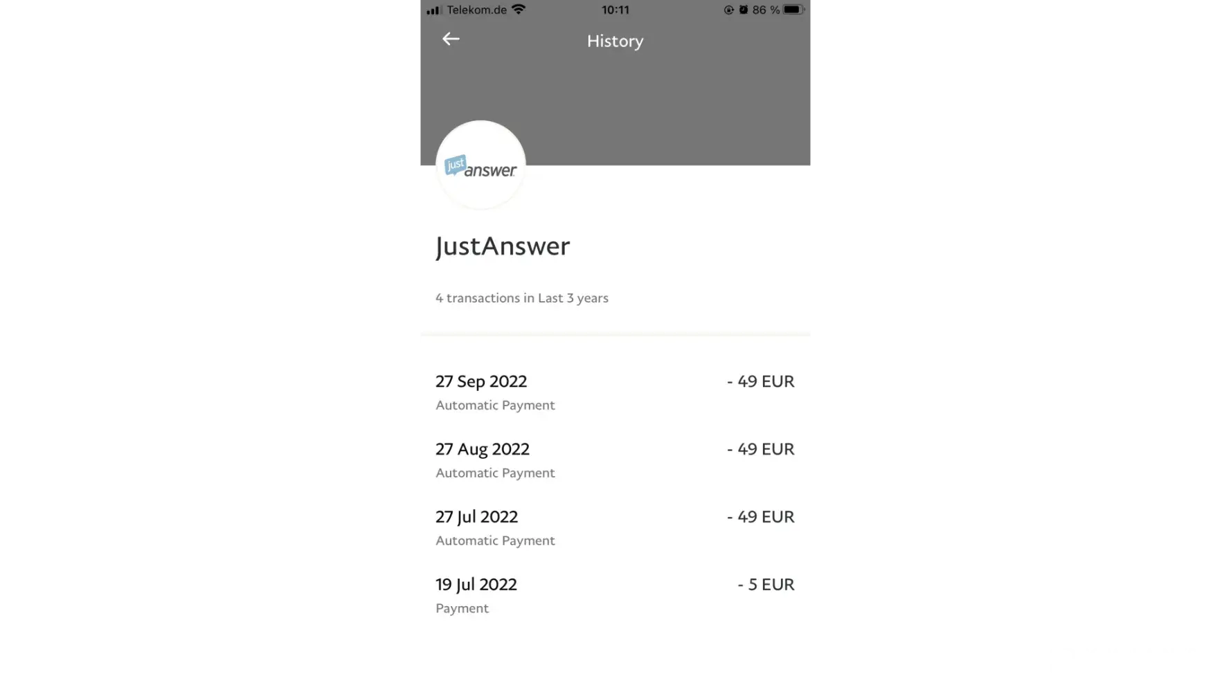 The just answer webpage said that its EUR 5 for a question. I asked the question and received an answer. I also received EUR 5 charge. However, I recognize that a membership fee of 49 EUR/month was already 3 times charged to me on my Paypal acount (EUR 147). I had no idea I was signing up for and have not used since I asked the very first question.