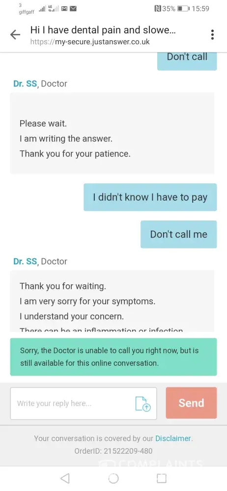 After that been chatting with doctor somehow been offered a phone call instead of chatting, wich I accept. I didn't know I have to pay. After a wile checked my bank been charged 34 paunds fee. Quick I write back to doctor to not call me couse I didn't know I have to pay. However I tried to contact with customer service to explain the situation but suddenly no answer.