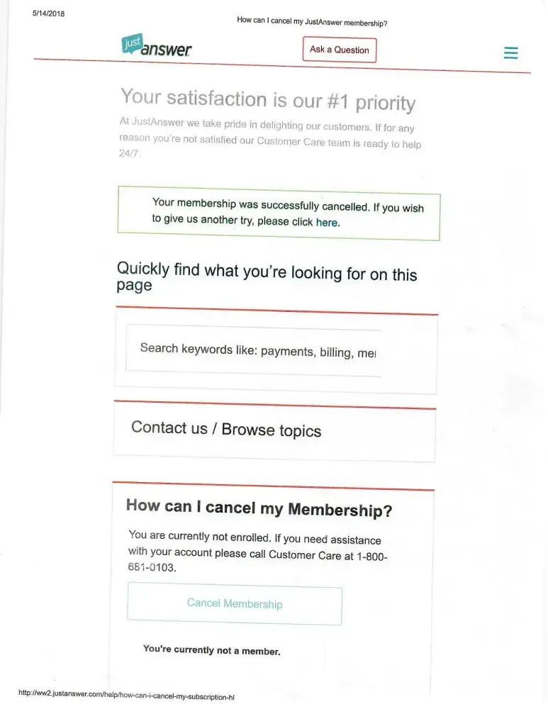 I am from Melbourne Australia, I have a new Canon printer under warranty. I was using Google to get Canon Australia. Your operator came on the line, on the 8th June 2018, I gave my credit card details without knowing that was Just Answer. As soon as I realized it was your company I told the operator not to use my ANZ credit card & disconnect her. Used Canon Australia and rectified my problem on the same day after few minutes.