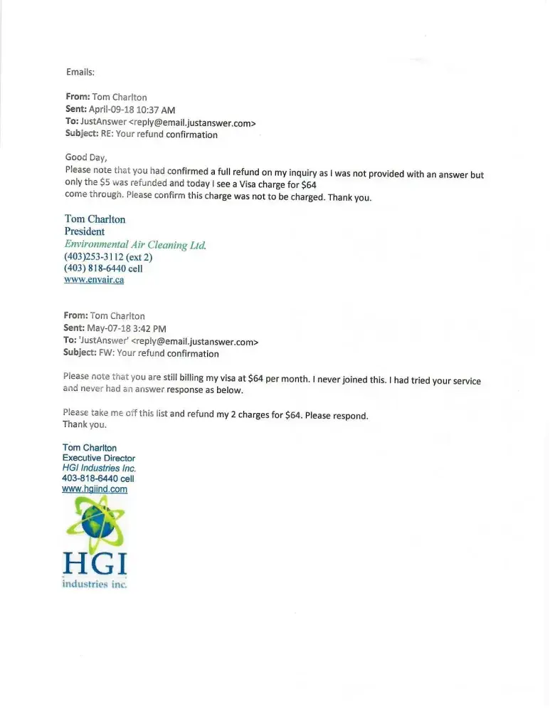 I have sent this complaint previously but receive no reply. I contacted JustAnswer once (it was useful) about a tax matter - but at no point did I take out a subscription or authorise these deductions from my account.