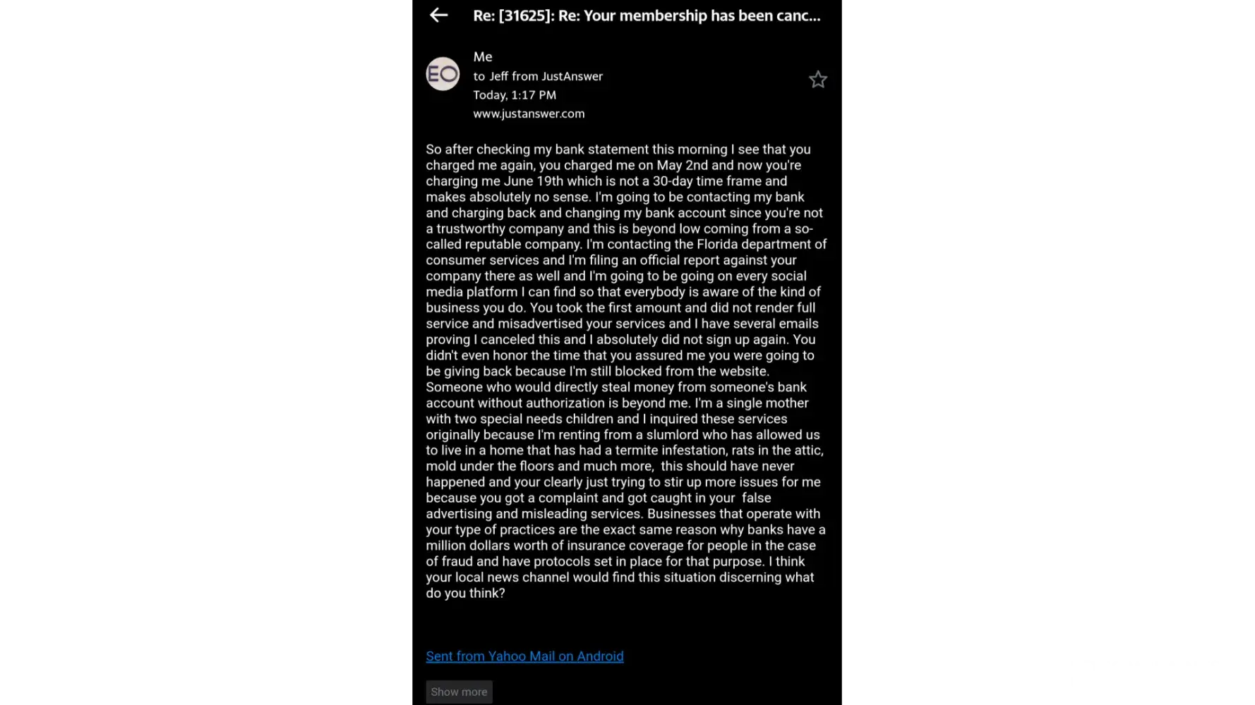 Just Answer is an ABSOLUTELY FRAUDULENT WEBSITE, And I intend to expose this website for its Cut-throat and Dog-eat-Dog approach to business! I came in contact with them when I had my email hacked into and could not access my email account on Yahoo. I was very desperate and needed help as I had some very vital information in my email account. Method of last resort - Just Answer - BIG MISTAKE. I read their terms and conditions and something about them did not quite register. I tried to leave the site, but they kept luring me back with more lucrative offers which all seemed too good to be true! They said you could not be billed on Answers that did not satisfy you, and even offered a discount. At one point they even asked me what I would like to pay them. At the end of the day, none of their answers was satisfactory, yet because I had entered my Bank account details with them, they automatically billed me, wait for it - £54.88p - YET NONE OF THEIR QUESTIONS WERE ACCURATE, AND I WAS STILL FROZEN OUT OF MY ACCOUNT! My Anger with this Website is the Audacity which which they take out money from people's bank accounts not to mention all the Grief, despite their 100% Money Back Guarantee! I have absolutely learnt My lesson with this Organization, and will ask my bank to initiate a refund action against them! These Cyber-Demons Should be exposed for what they truly are, and ever were - A BLOODY SCAM!