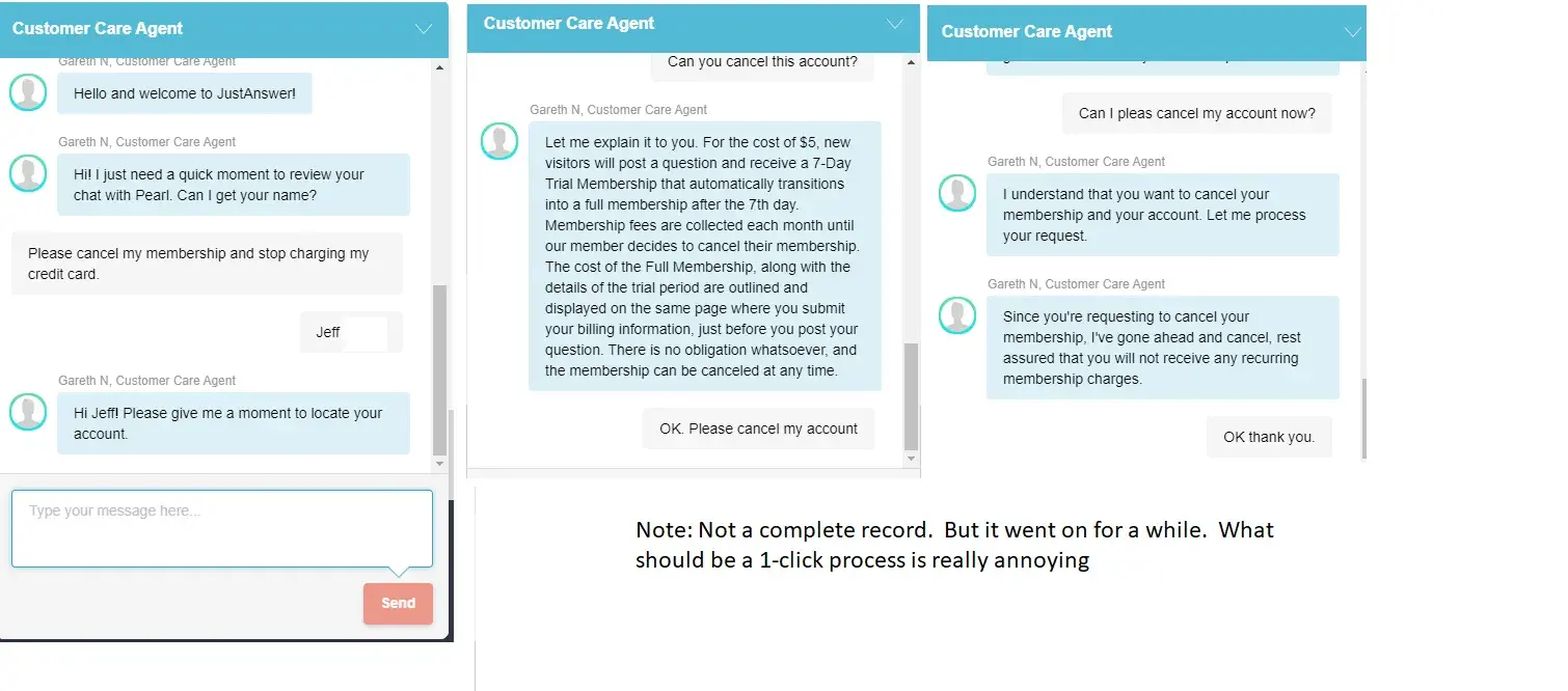 Justanswer scams so many and just just give everyone the same robotic answer which is probably written by some very lawyers to word their thievery so it’s at least so it passes as legal. I’ve been hung up twice in mid conversation which was just me calmly explaining my issue which clearly takes advantage of innocent people.