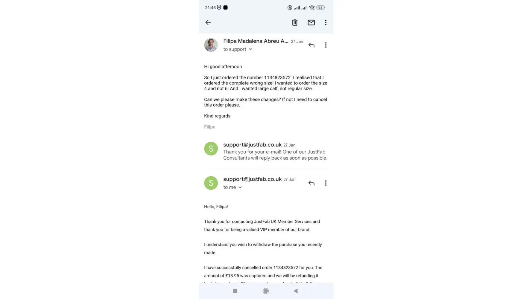 The order number is [protected] and I ordered this on the 27/01/2022.