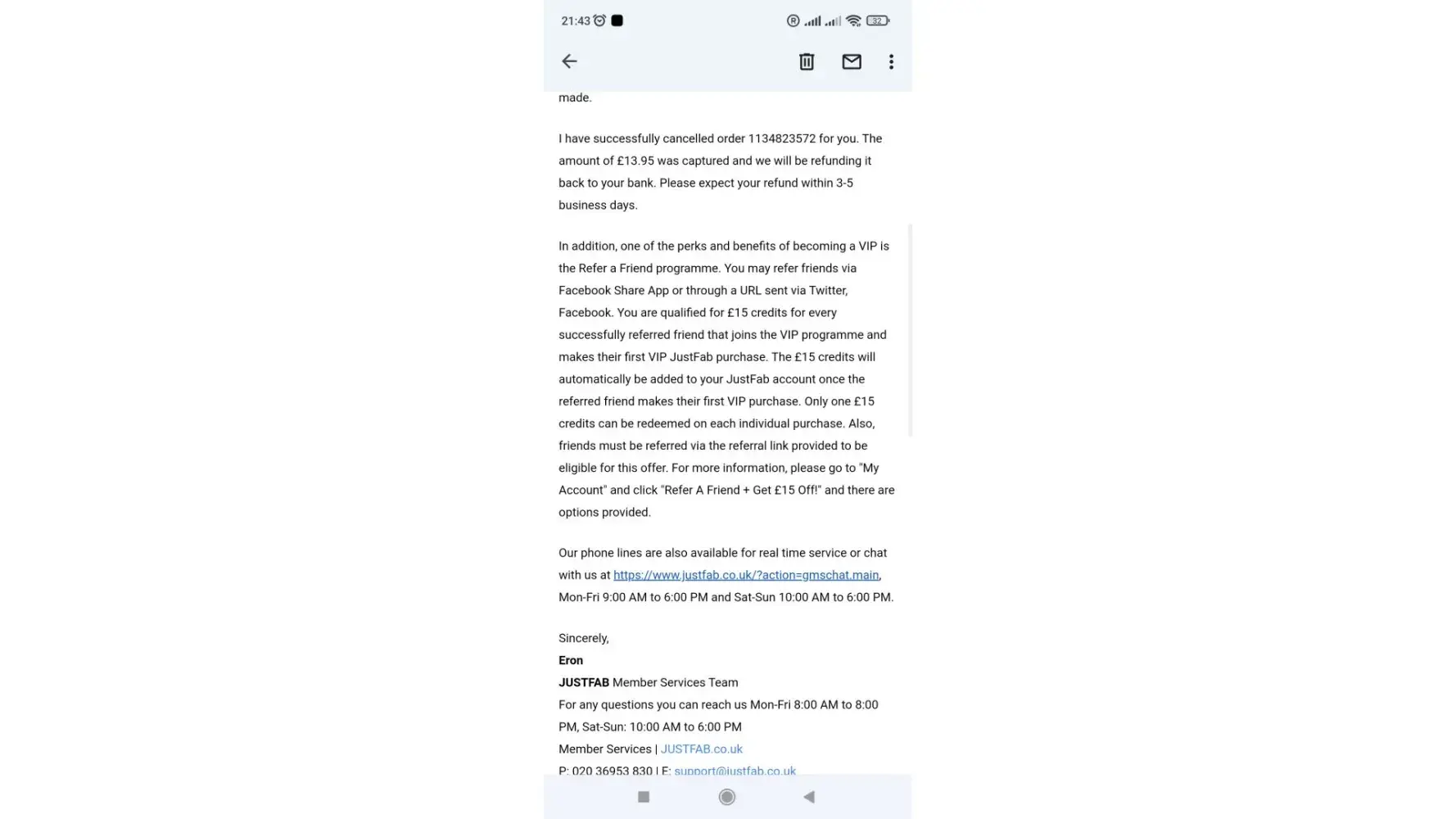 Desired outcome: Refund for my 39 pounds