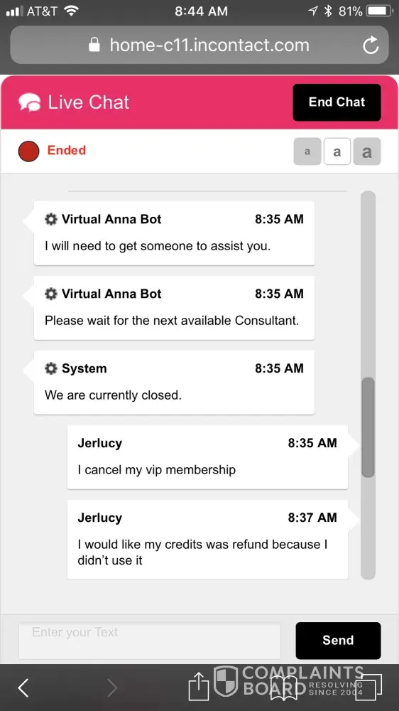 I'm complaining about I was discounted of my card 3 months of vip membership (I didn't know about that when I bought a boot) I never used that credit than I cancel the membership and I want to refund in my card. I tried to speak with them by cellphone I didn't get, I send a message and they don't asking me. I don't want credits in that site because I will never more byu something there