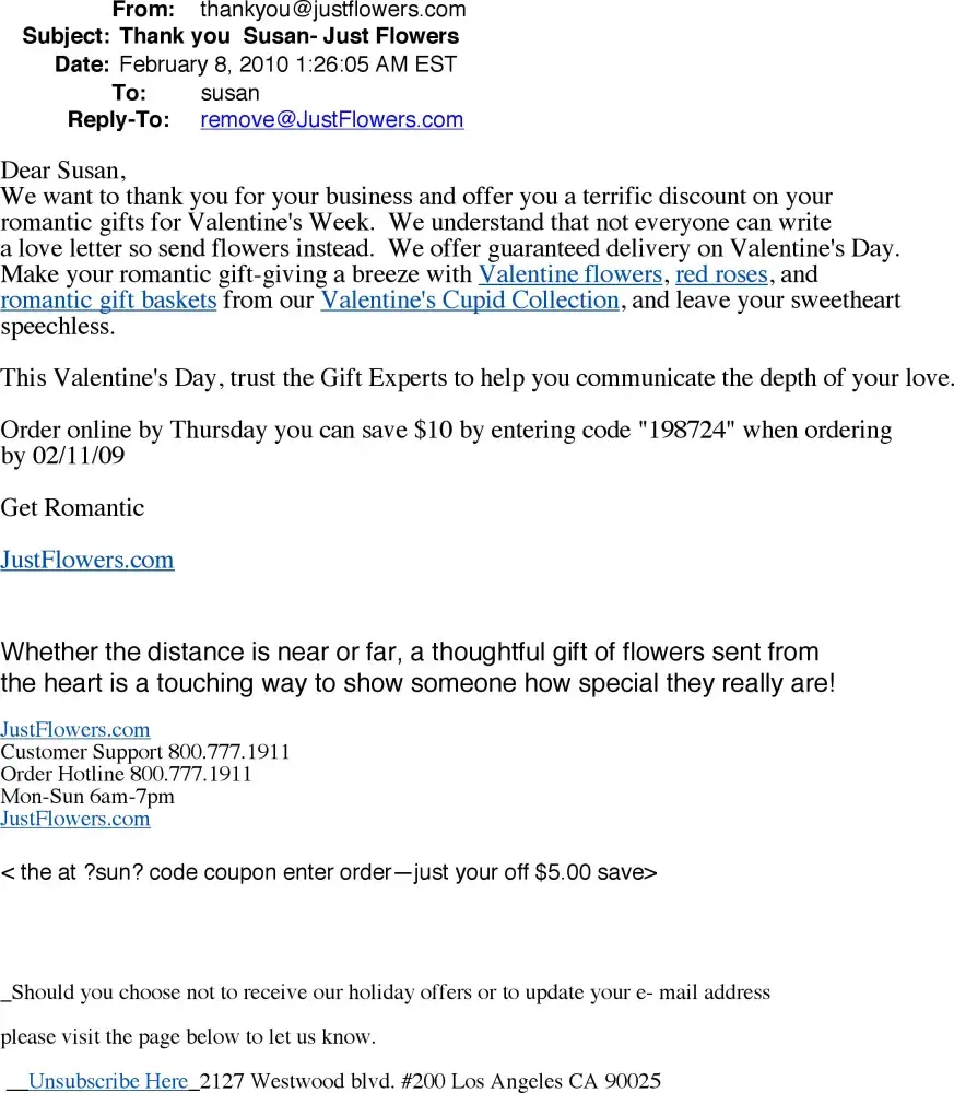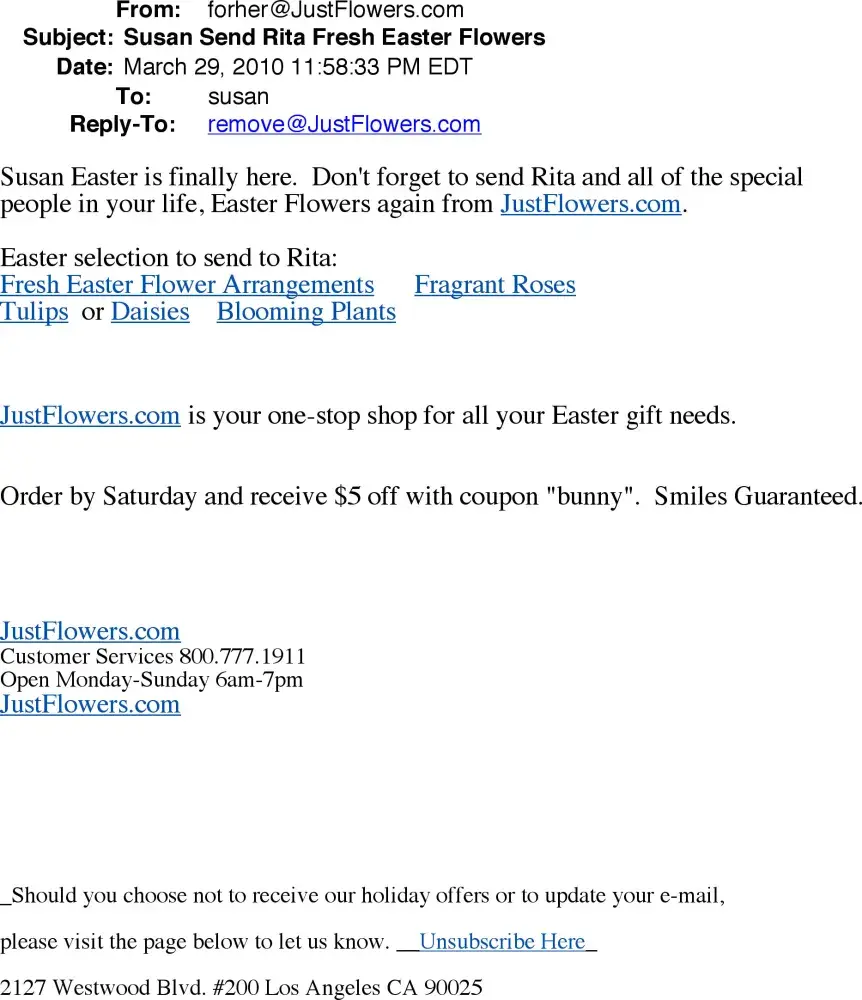 After their failure to deliver flowers on mothers day a year ago I have been sent email solicitations relentlessly by justflowers.com. I have clicked the "unsubscribe" text at the bottom of the emails many times but am still receiving them. I even called the company and in spite of assurances that I had been removed from this company's email list I still...