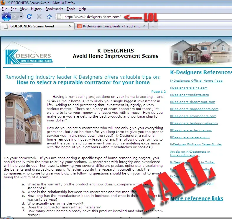 Their sales pitch…. Well, K-Designers uses the oldest gimmick in the book. The movie 'Tin Man' accurately depicts this company. K-Designers approaches ALL homeowners with the same sales pitch... "We want to use your home for our promotion. If you agree to allow us to use your home to market our product, we have marketing dollars we will spend on your home. These marketing dollars will save you thousands of dollars if you do business with us TODAY, WHILE I AM HERE! (Not tomorrow, but NOW).