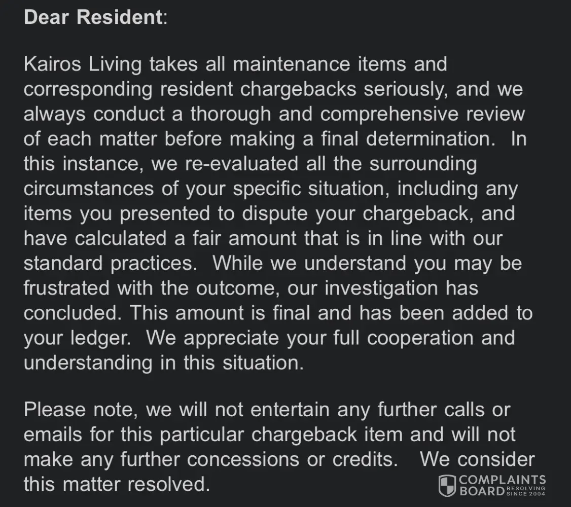 Now this month we have an issue with the utility company, which Kairos uses for water services as per the lease agreement that states the water bill must remain in their name. The utility company is trying to charge us for an electric bill, and their response is to direct us back to Kairos. I've reached out to Kairos and provided proof of residency with the start date of my service, but it's not sufficient for the utility company, so I've had to contact them multiple times in a short span to coordinate with Kairos. Kairos has become non-responsive.