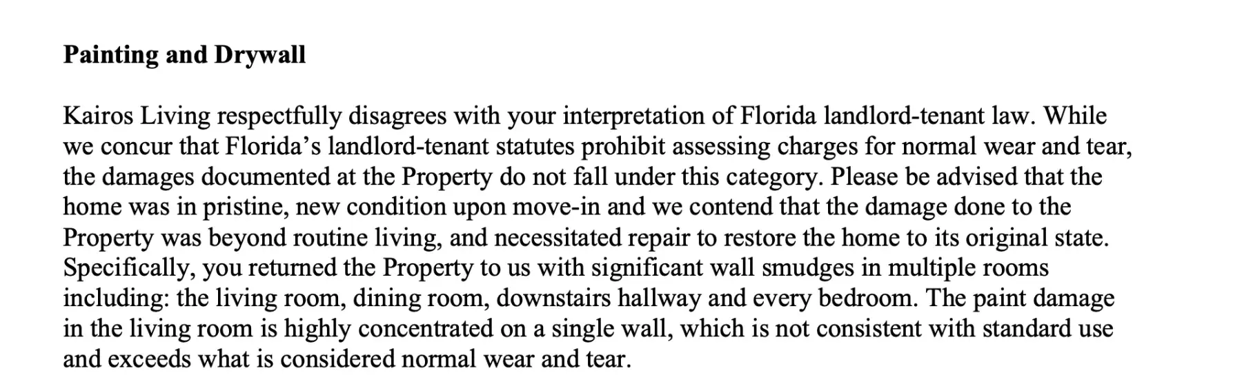 This entire process violates Florida Statute §83.49, which strictly prohibits landlords from deducting normal wear and tear from a security deposit and requires a proper, timely itemized notice.