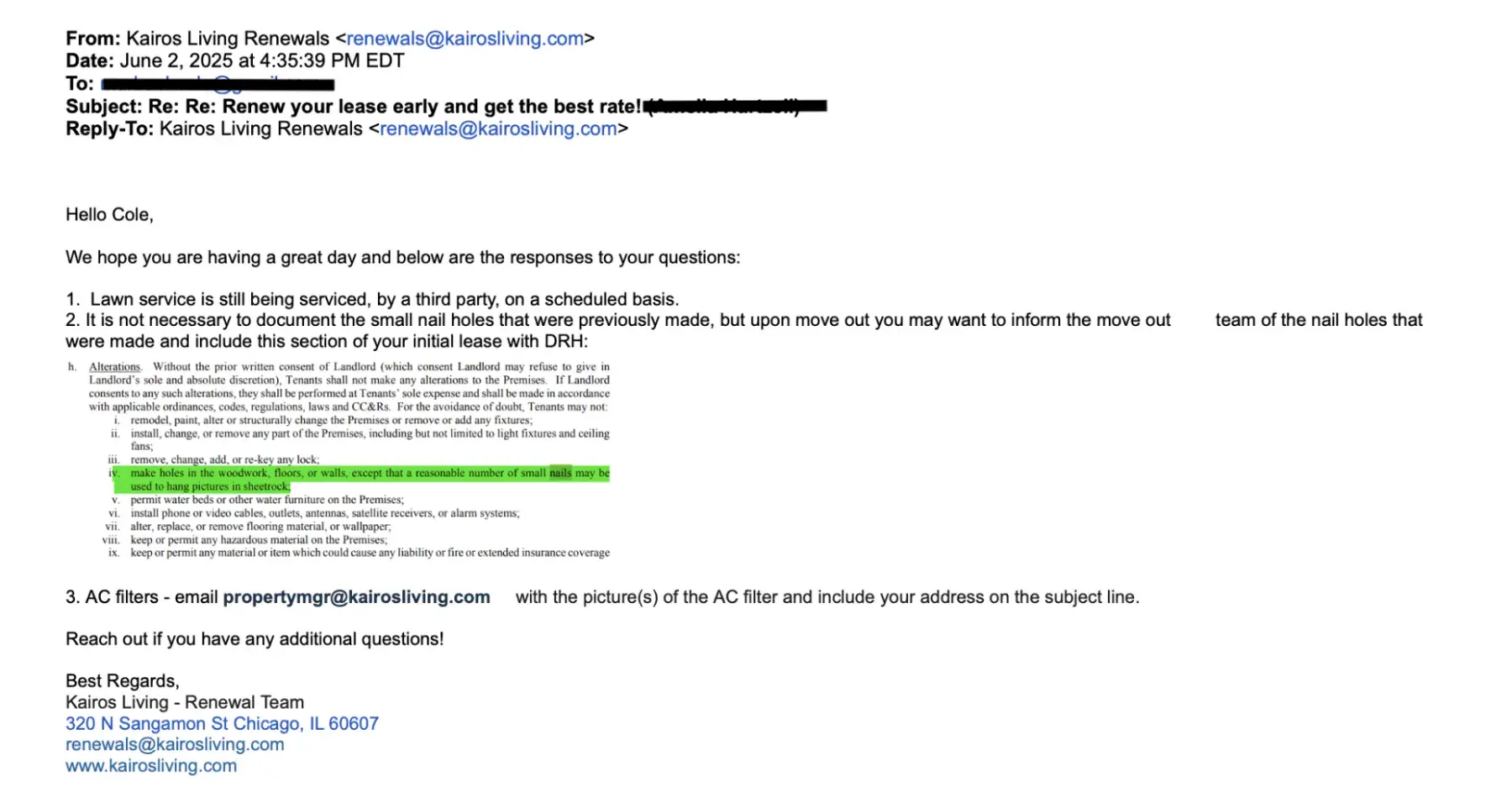 Before we renewed and signed the lease with Kairos, we showed them our previous DR Horton lease that explicitly permitted small nail holes and hanging pictures. In their June 2, 2025 renewal email, Kairos told us it was “no big deal†and to simply inform the move-out team. Yet they still tried to charge us for normal wear and tear after 20 months of living here (only 8 months under their management).