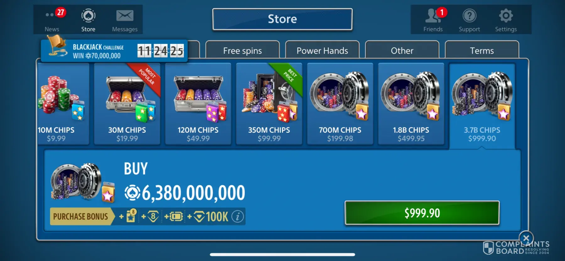 Today 10/30/23 at 4:00 pst, I set my IPad down and the main screen was showing and I had 1.9 bil chips, I came back picked up the IPad and it was on the new Jackpot Blackjack game they were pushing and my balance was 1.6 bil. They strategically place the “Play now “ buttons on the main screen and if you accidentally hit them putting down your phone or iPad, BIZINGA there goes 300 million which just happens to be the minimum bet, WTF. I don’t play 100 mil games, so it took quite a while and money to get to this point. If you don’t pay careful attention and go to a different game your minimum bet could be in the millions. I raised this issue with support, and basically they just said too bad. See my balance for yourself, KingInNorth