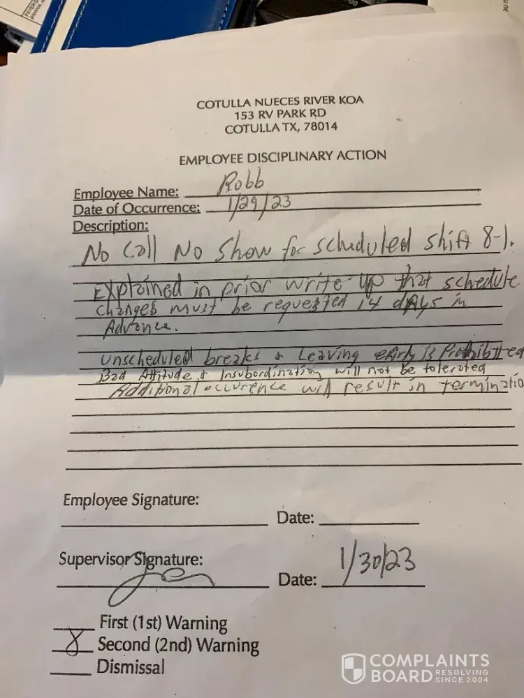 Cotulla KOA, were he handed a piece of paper to Rob, dated January 16, 2023, and told him to sign it.