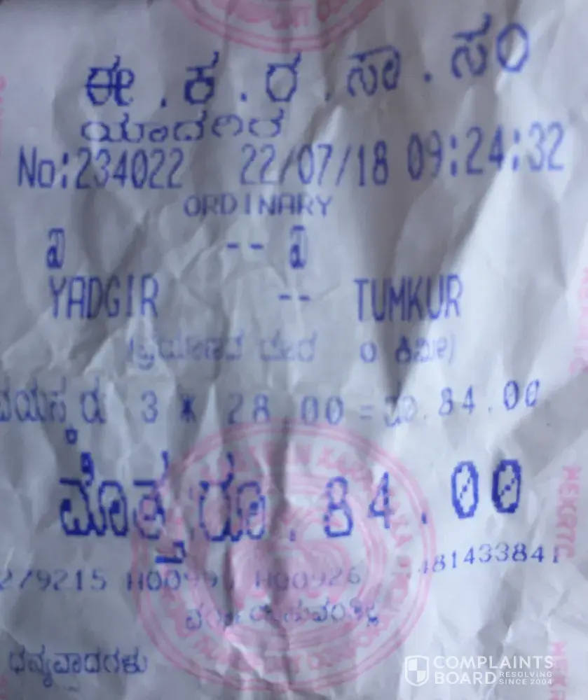 Regarding the above mentioned subject I Dakshayini BM, aged about 65 years, residing in Vidya nagar, sira (T), Tumkur (D) explaining here the rude behaviour of conductor and driver. When conductor asked me to take the ticket for my 5 year 10 months old grandson I have told her ticket applicable after 6 year completion but suddenly she has started abusing me without considering my age and senior citizenship, and she has told to driver to stop the bus and to get down us from bus and driver stopped the bus the place was dark and it was middle of road, but after seeing her rude behaviour co-passengers told me to take ticket suddenly she picked forcefully the Rs 50/- currency note from my hand and given ticket. I have asked her is the ticket amount right? She has replied by abusing me are you blind? I have given right check it out. And she also scolded my grandson don't go to school be in home so he was started for crying. When I have come to home and saw the ticket issued it was RS 30/- but she has taken Rs 50/- in this way she has insulted, mischief, cheated and made loss to the KSRTC.