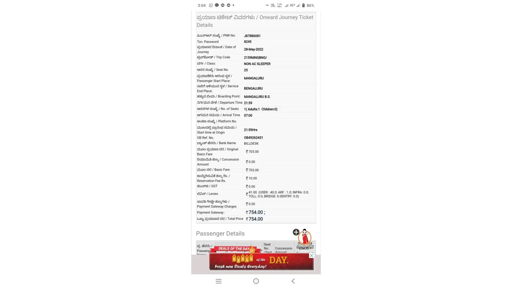 I, Claude D Souza (62) had booked an e-ticket for my son Clafton Siddharth (25) from Mangalore KSRTC busstand to Mysore for 13th September 2020 by 10.00 pm bus paying Rs. 485.00. The PNR No was J82584224 Bus No: F 5488, crew mobile number [protected]. As my son's mobile went out of order at the last minute I went to the bustation along with him. It was a Sunday and was raining heavily. Being Sunday, a holiday, we could not take a print out of the ticket as the photo-shops were closed. So I accompanied my son to the busstand as I had the E Ticket and PNR number in my mobile.