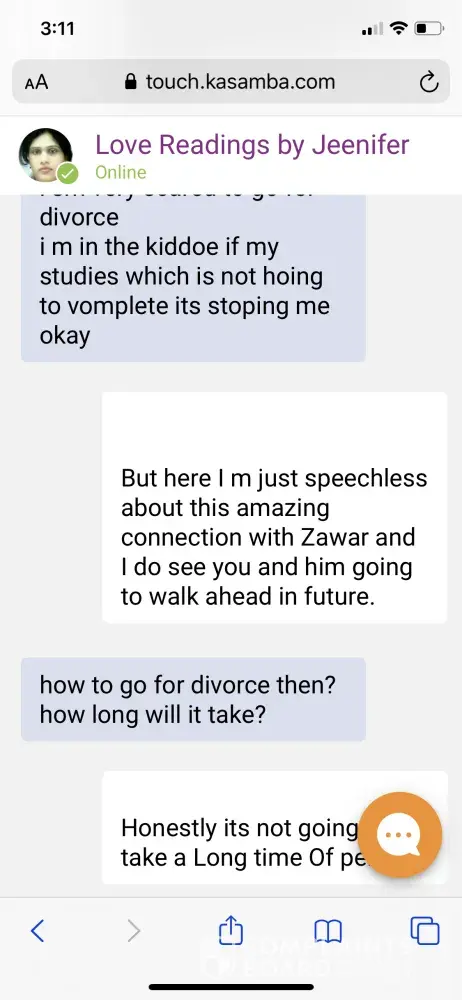 Met a guy and my marriage life was not going well. Kasamba psychic told me that guy is perfect fit for me and connected to me on spiritual level. But that guy took 28k dollars from me and ran away. What a joke. They told me that I will divorce my husband which did not happen.