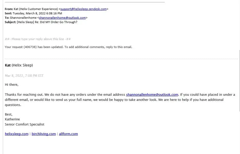 8 business days after that auto-reply from Helix I received an email from Helix confirming there is no order. I forwarded the email to Katapult. They replied that they had to have confirmation directly from Helix to them. Really? It's right there in black and white from Helix to me.