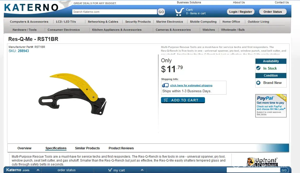 DO NOT BUY FROM KATERNO.com --I searched for price comparison for a fire/rescue tool called a spanner wrench multi tool. I found a listing for this product on Katerno.com. I then saw the item picture and the description and it all seemed good. There were no options to select for the product just a good old fashioned Buy Now button. I bought the item and it was delivered in just a few days. However, it was a much different item than I ordered and not the item in the picture. It was a window punch made by the same manufacturer. Assuming that it was just an order fulfillment mistake I informed Katerno customer service. The response was that i received exactly what I ordered and they referred to a cryptic product name Res-Q-Me - RST1BR. They then explained that deeper in the description the description refers to the product I received and by connection of this reference to the name, I ordered. This is the description: "Multi-Purpose Rescue Tools are a must-have for service techs and first responders. The Res-Q-Rench is five tools in one - universal spanner, pry tool, window punch, seat belt cutter, and gas shutoff. Smaller than the Res-Q-Rench but just as effective, the Res-Q-Me easily shatters tempered glass and cuts through safety belts in seconds." after sending them back their order and shipping confirm. emails with the spanner wrench (ResQ Rench) pictured. They still told me I ordered the wrong item, the ResQ Me. I then asked for them to at least acknowledge that it was a misleading product page and they still told me that I got what I ordered.