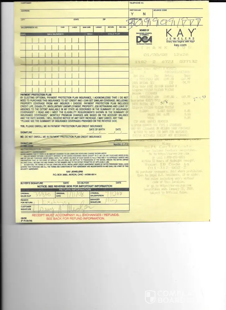I have gotten many gifts over the years from my beloved husband. My 15 year anniversary is Dec 3 and I was going to trade in my engagement ring for a much bigger stone of 2 ct. I went to the store on Princeton Rd. On Nov 13 and picked out the ring I wanted I then call my husband to ask if I can put it on his Kays card. after saying yes I asked the sales person to do so. The lady asked for my husbands complete SSN and my yearly income I gave it to her thinking she needed the information to pull up my husband information to make the purchase. She pulled up his old information from when the card was original opened. The computer said that my husband card is under review and I left confused.