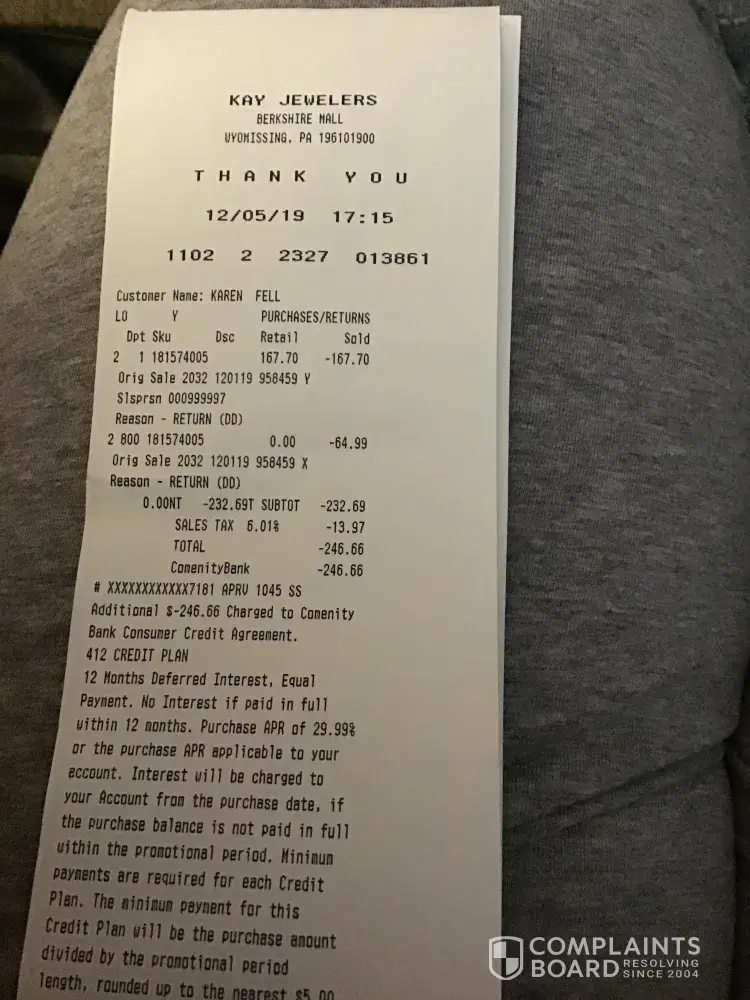 My wife and I decided to pay the credit card off.in full as was the total bal on statement. We get hit with a tailing 12 lousy dollars "of interest"that was refused to be dropped. Both rep and supervisor (chris) was very unwilling to vacate the charge and very willing to close the acct. So we closed it and will not patronize stores again. I find it very anti-customer friendly responses we recvd. Our payments were not only on time but over on many occasions. I seriously feel we got punished. So we will punish back. With xmas coming? Oh well. No jewelry from kay.