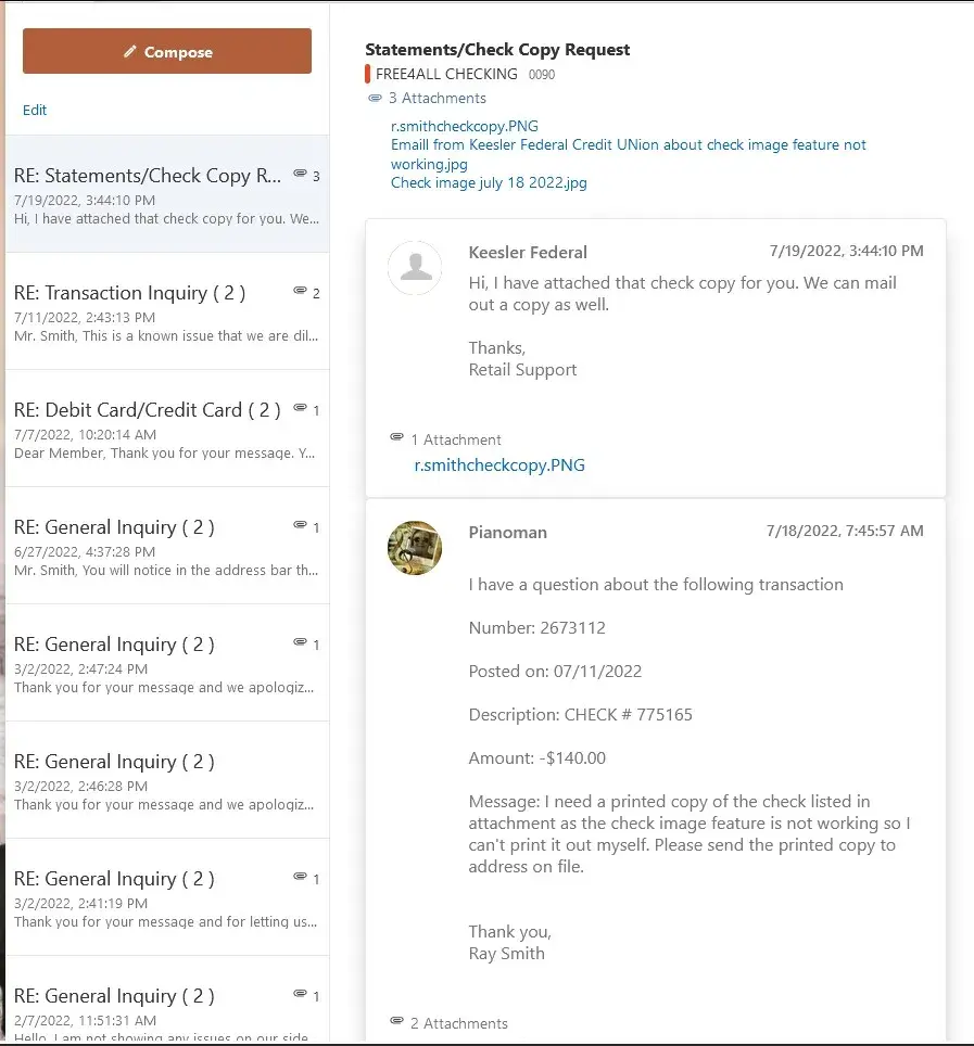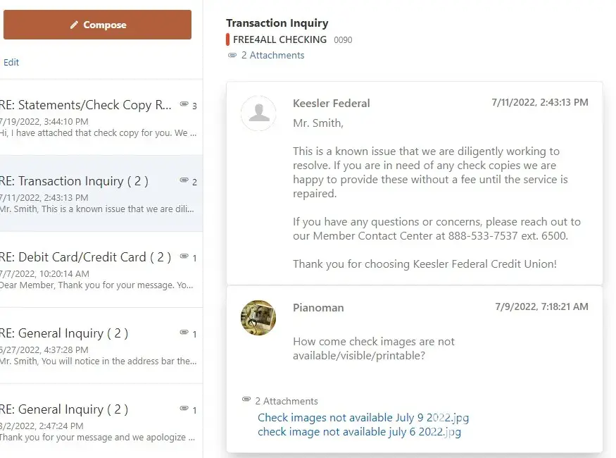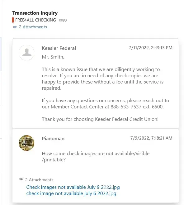Keesler Federal Credit Union has received 2 complaints on ComplaintsBoard. The first reported case, Wire refusal for a christmas party in nigeria, was published on Dec 27, 2018, and the most recent complaint, Checking image feature not working, was posted on Jul 22, 2022.