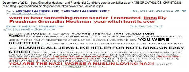 9. That Ilona negotiated the commission due to Wolk & Associates / Janice Wolk Grenadier Broker to reimburse the Sonia Grenadier Trust for the stealing of the Trust’s Funds. Janice at the time was in a very fragile state just having a miscarriage at around 5 months, her daughter born 10 ½ months, July 6, 1990 with an emergency c-section and a heart issue. Her other daughter was then born 16 months later November 6, 1991 with a c-section. At the same time David Grenadier was curled up in bed saying all he wanted to do was to commit suicide. Ilona told Janice it was her problem to deal with. Ilona told Janice that David would end up in jail getting raped and beaten if Janice didn’t agree to the assignment of the commission. Ilona would ask Janice how she would like taking her children to jail to see their father. It was under much distress that Janice agreed to assign the commission as Janice was basically the sole supporter of the family, Janice had worked hard over a year to sell the Holland Road property. Ilona also threatened Janice that she was not to discuss this with anyone, including any attorneys and especially her husband Jerry Heckman was not to know of the stealing money from the Sonia Grenadier Trust. Ilona and David knew Janice wasn’t as strong as they were and they would be able to control Janice with the threat of David going to jail and being raped and beaten, with how this would affect the girls. To date Ilona their grandmother hasn’t seen Abigail and Madeline Grenadier in 17 years by Ilona’s choice. David sees the girl’s maybe 6 – 8 times a year and in 13 years has never helped above his court ordered child support with the girl’s expenses. Ilona did recently inform Janice that she and her family didn't have anything to do with the girls as Janice raised them Catholic ~ Ilona is Jewish.