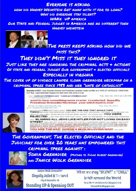 The State of Virginia and the Federal Courts have colluded together with their Judges to CRUCIFY Janice Wolk Grenadier. We in the United States of America needs to "Wake Up" https://amlegalnews.blogspot.com/2019/08/the-rule-of-law-in-usa-lost-due-to.html