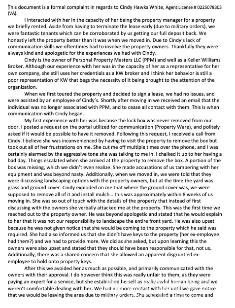 Complaint detailed in attached photos due to length. In regards to agent Cindy Hawks White of Virginia Beach, VA ; Agent License # [protected] (VA).
