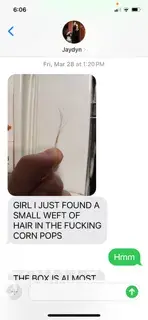 Daughter got down to 1/4 remaining box when she found about 15 rodent hairs wadded together by an oily, waxy, yellowy clump that had semi-even, ripped-out hair shaft endings. Non-human hairs have variegated tones of black, browns, and tans throughout all strands (I saved them). She sent me a pic of her find March 28th, 2025, placed the hairs in a small...
