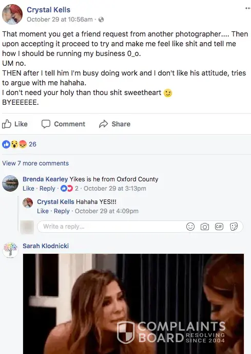 I have to agree with the poster. Crystal Kells is not a professional. She's a hot head with no self control. I don't know her from a hole in the ground, but I had the displeasure of coming across her path today. Because she disagreed with a comment on a public forum, she verbally attacked me. When I said I'd be interested in a grown up conversation, she escalated. So I left the group. Only to find out 5 minutes later she stalked my Facebook and laughed at all my photos with my 10 year old child's accomplishments. This is not a person I would trust taking pictures of my children, when she clearly doesn't respect others privacy. Not a stable person at all.