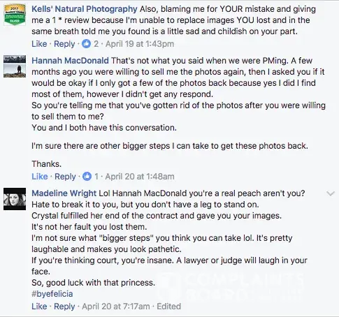 Kells' Natural Photography run by Crystal Kells (Crystal Wright) is a photography "business" run out of Ancaster/Hamilton, Ontario, Canada. Not a very professional one! Crystal Kells begs for likes and reviews on facebook. Whenever someone leaves a real review, usually one star, she either deletes the review or responds to it by reacting like a child throwing a temper tantrum including having her relative Madeline Wright come after the reviewer. Actually, Madeline Wright has no content on her facebook page so I can't help but assume this is Crystal Kells under a fake account.