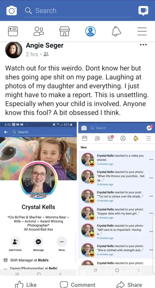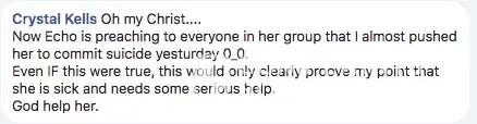 Here we go again... Crystal Kells is on another one of her crazy tangents, this time calling out a woman who has been raped and harassing her to near suicide. Are you sure you want to do business with Crystal Kells of Kells Natural Photography? Anyone standing up for her at this point is as mentally ill as she is. Crystal Kells is mentally ill and I feel sorry for her son. I hope she gets the help she truly needs.