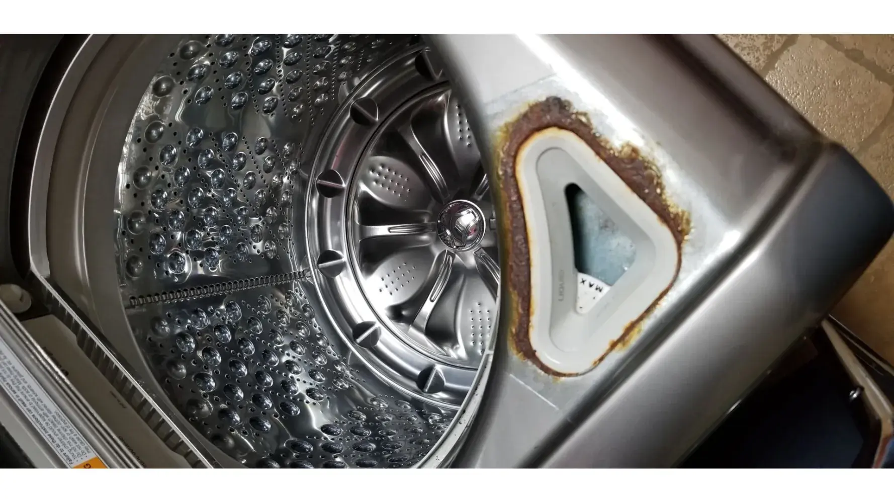 Rust build up around the bleach dispenser. Washer still in good condition and have been happy with its performances, However, the rust is getting worst.