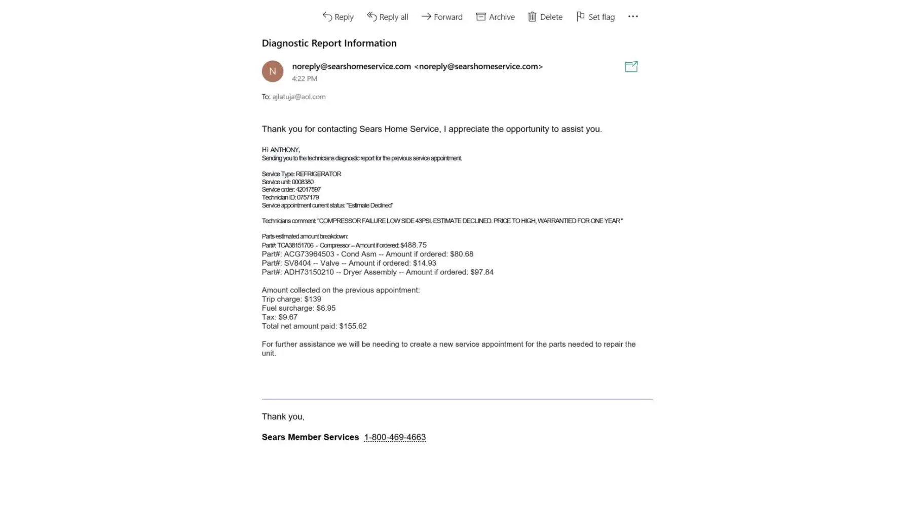 model bought April 2019. Stopped working January 2022. Had Sears service here. It is a kenmore. They said compressor needs replaced. Service order # [protected]