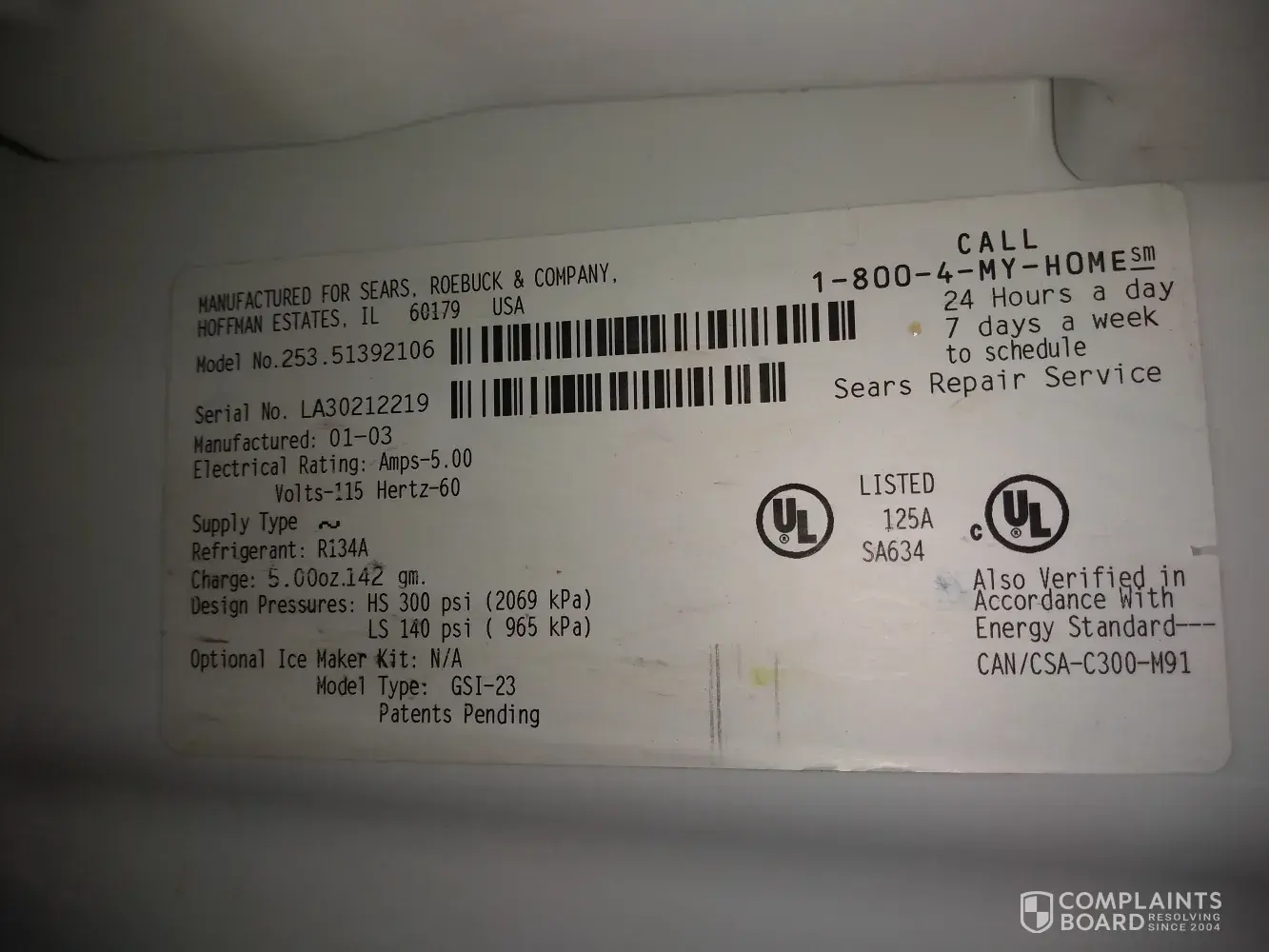 sears kenmore side by side refrigerator model 253.51392106
