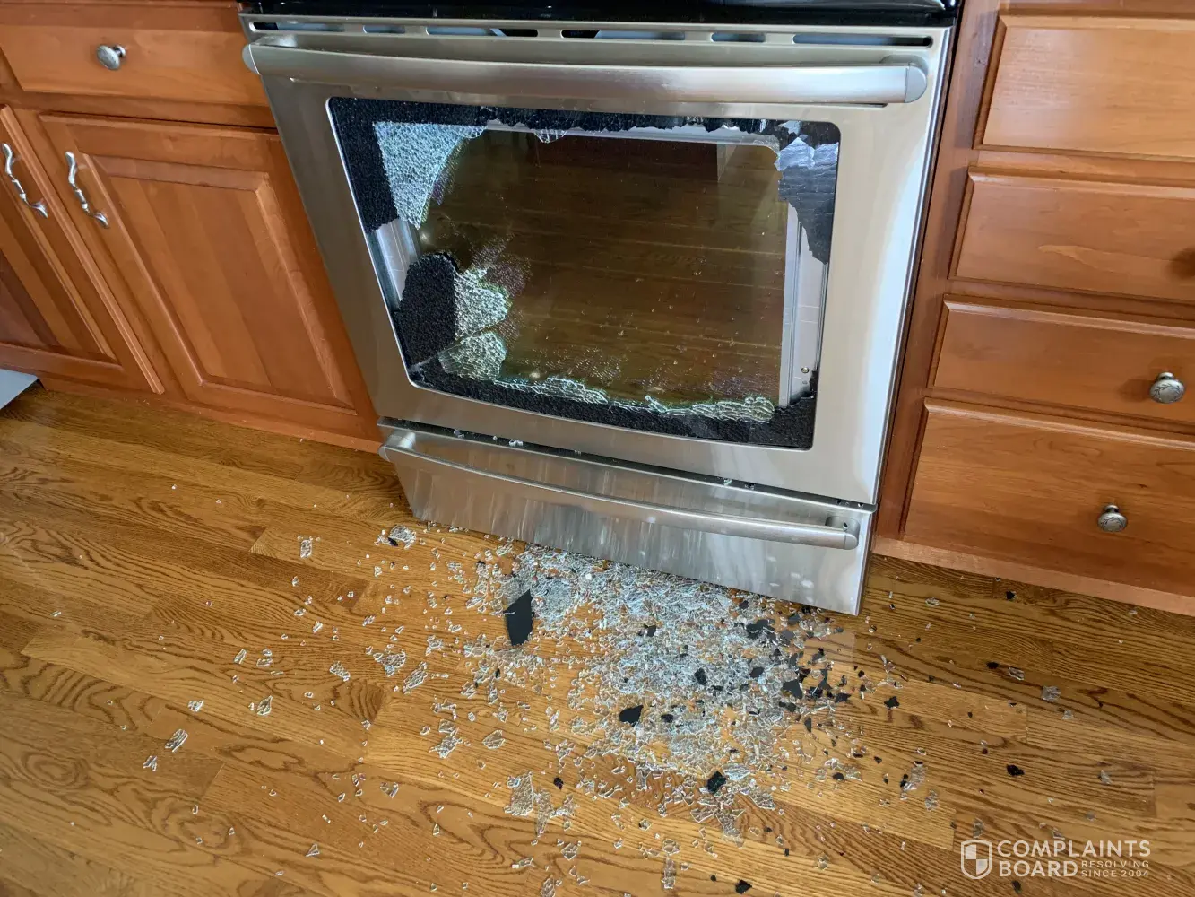 I bought this range in June 2016. The first time this glass broke from the oven door was in June 2016. Today, my daughter and I were in the living room talking when we heard a loud crash. Out of the blue, the oven door glass broke a SECOND TIME, within 3 years! This is ridiculous! I am totally disgusted and angry, also with the fact that the impact of the glass has scratched and dented the hardwood floor I have in my kitchen!