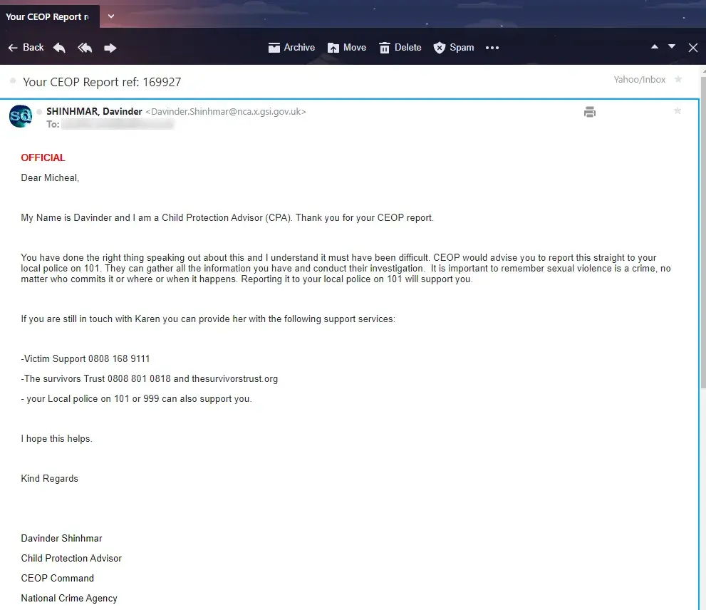 Supporting police evidence sent by the perpetrator and CEOP Child Exploitation Services report National Crime Agency UK