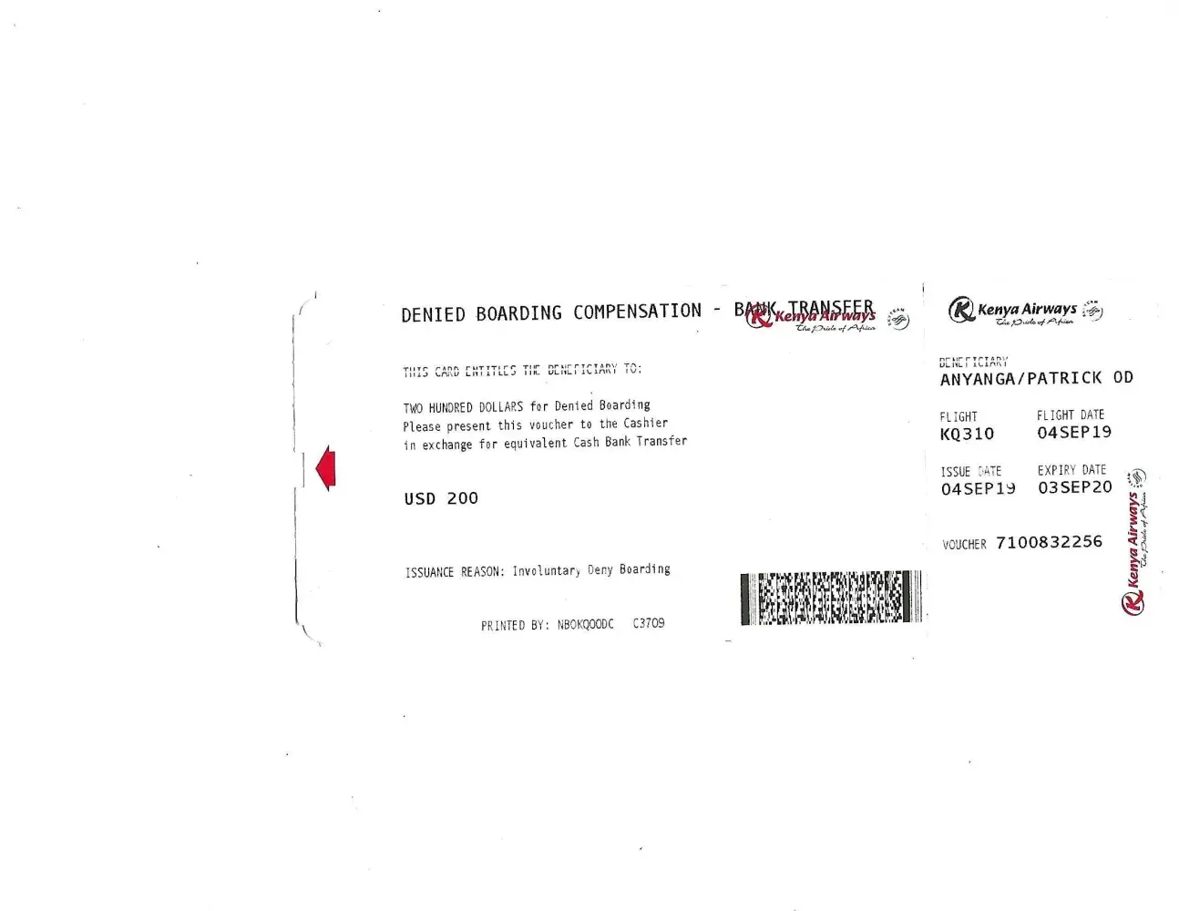 On the 4 September 2019 travelling from Nairobi to Dubai KQ 310 i was denied boarding due to overbooking.After briefing by the in-charge at the boarding counter JKIA, a form was given to write the Bank accounts for the compensation of USD200 to be transferred in bank which has not been effected up to date.